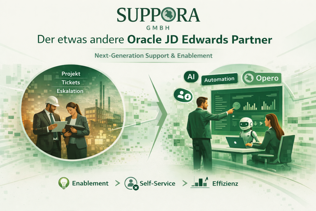 Warum die Suppora GmbH der etwas andere Oracle JD Edwards Partner ist! März 30, 2026 Suppora GmbH denkt ERP-Betreuung neu — weg vom projektgetriebenen Modell, hin zu stabilen Betriebsstrukturen mit der Opero-Plattform.
